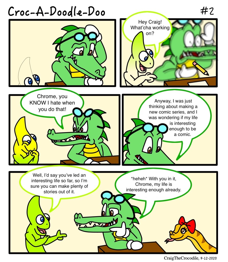 Croc-A-Doodle-Doo #2 Posted bycraigthecrocodileSeptember 12, 2020September 16, 2020Posted inCroc-A-Doodle-DooTags:Chrome the Chameleon, Craig the Crocodile, Croc-A-Doodle-Doo Share this: Share on X (Opens in new window) X Share on Facebook (Opens in new window) Facebook Like Loading... Related
