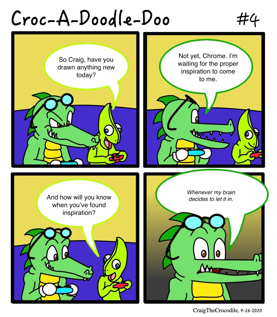 Croc-A-Doodle-Doo #4 Posted bycraigthecrocodileSeptember 26, 2020September 24, 2020Posted inCroc-A-Doodle-DooTags:Chrome the Chameleon, Craig the Crocodile, Croc-A-Doodle-Doo “Inspiration” Share this: Share on X (Opens in new window) X Share on Facebook (Opens in new window) Facebook Like Loading... Related