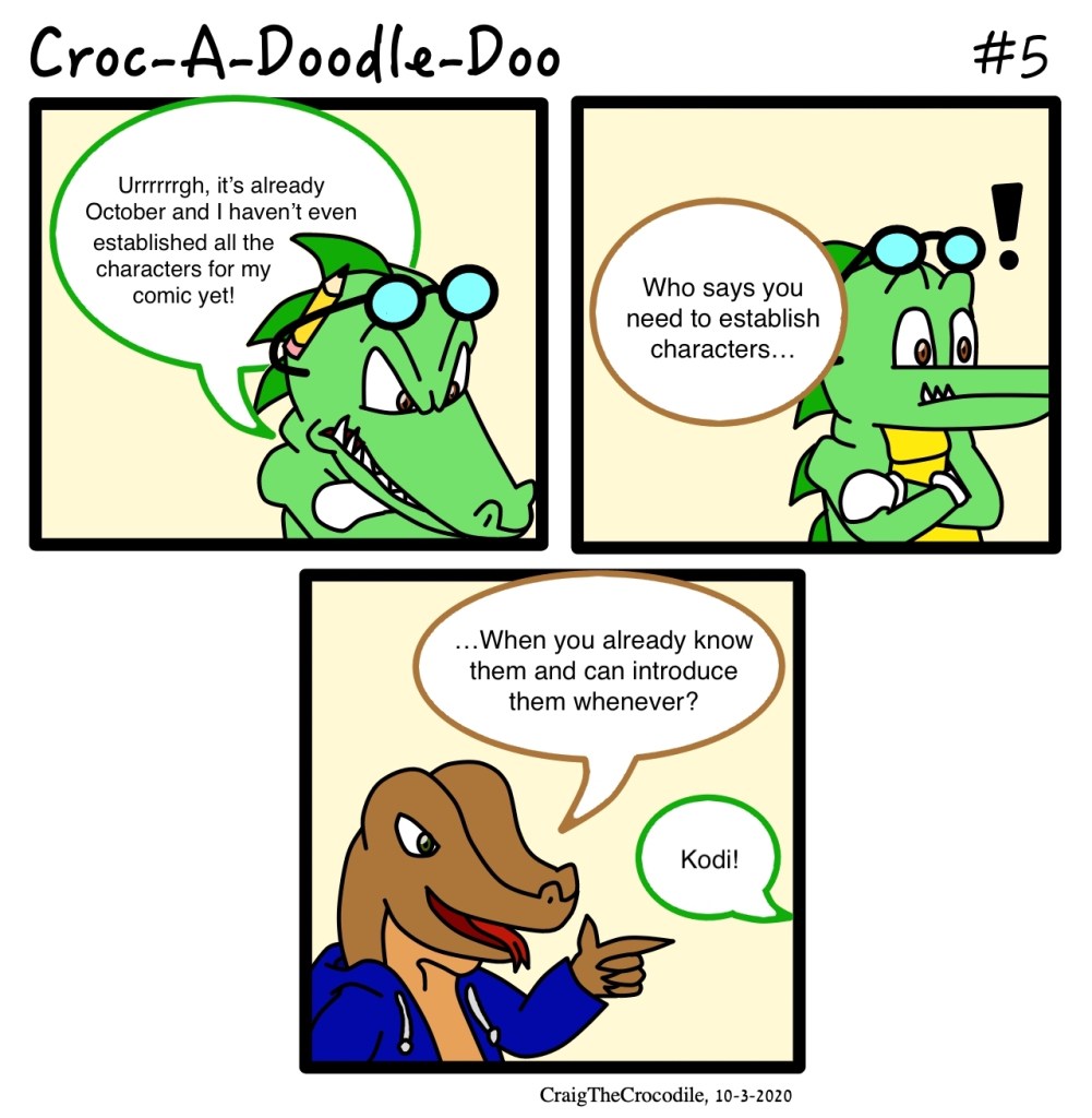 Croc-A-Doodle-Doo #5 Posted bycraigthecrocodileOctober 3, 2020September 29, 2020Posted inCroc-A-Doodle-DooTags:Craig the Crocodile, Croc-A-Doodle-Doo, Kodi the Komodo Dragon “Kodi’s Entrance” Share this: Share on X (Opens in new window) X Share on Facebook (Opens in new window) Facebook Like Loading... Related