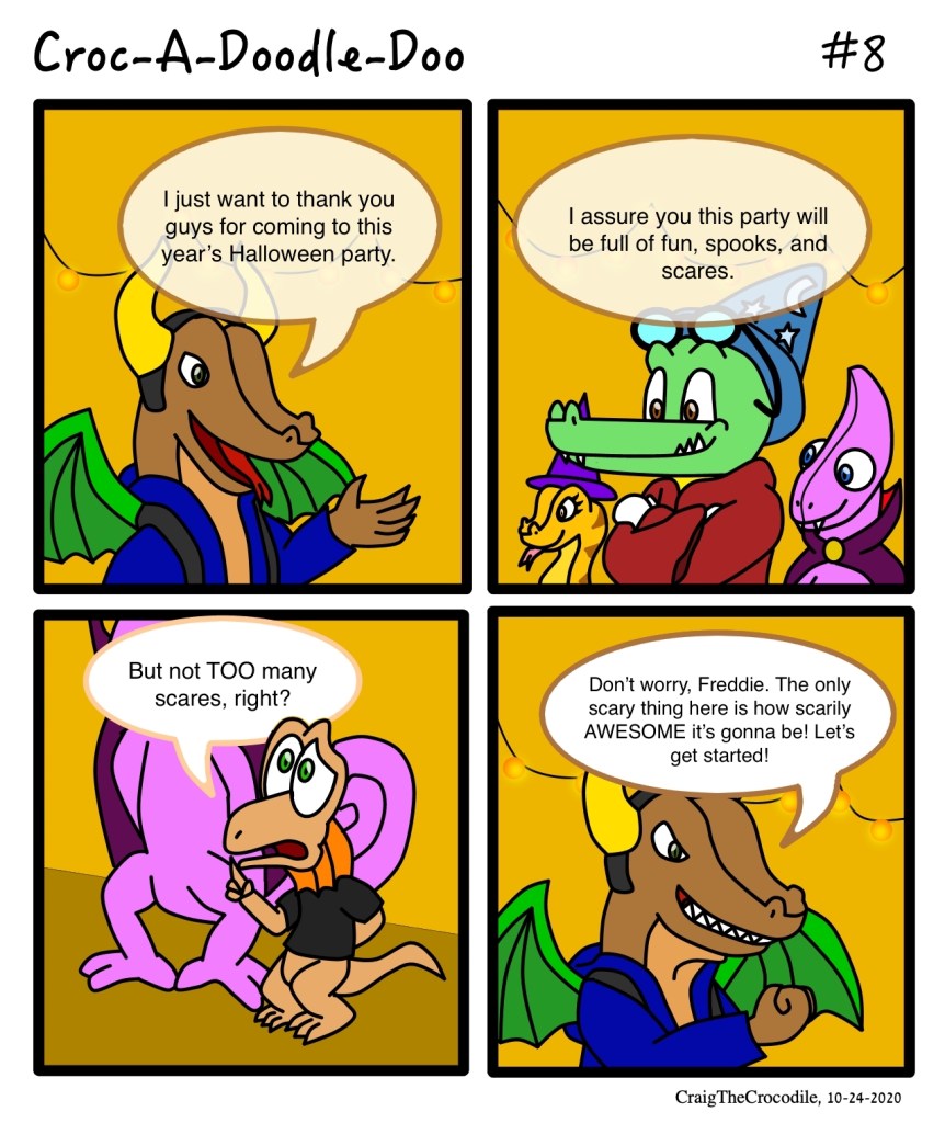 Croc-A-Doodle-Doo #8 Posted bycraigthecrocodileOctober 24, 2020October 23, 2020Posted inCroc-A-Doodle-DooTags:Chrome the Chameleon, Craig the Crocodile, Croc-A-Doodle-Doo, Frederick the Frilled Lizard, Halloween, Kodi the Komodo Dragon, Naggie the Python “Start the Party!” Share this: Share on X (Opens in new window) X Share on Facebook (Opens in new window) Facebook Like Loading... Related