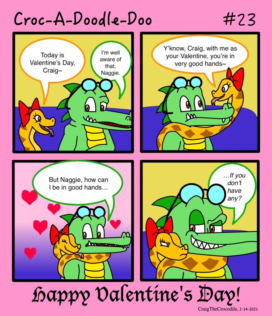 Croc-A-Doodle-Doo #23 Posted bycraigthecrocodileFebruary 14, 2021February 13, 2021Posted inCroc-A-Doodle-DooTags:Craig the Crocodile, Croc-A-Doodle-Doo, Naggie the Python, Valentine's Day “In Good Hands…?” Share this: Share on X (Opens in new window) X Share on Facebook (Opens in new window) Facebook Like Loading... Related
