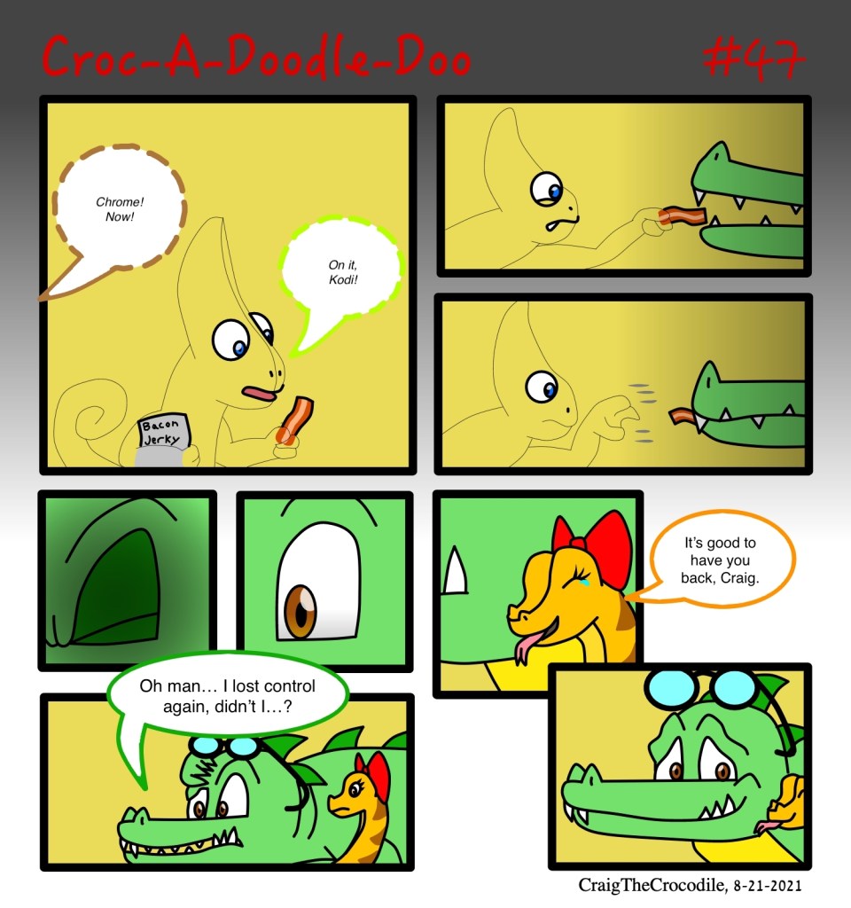 Croc-A-Doodle-Doo #47 Posted bycraigthecrocodileAugust 21, 2021August 20, 2021Posted inCroc-A-Doodle-DooTags:Chrome the Chameleon, Craig the Crocodile, Croc-A-Doodle-Doo, Naggie the Python “Going Wild, Part Final” Share this: Share on X (Opens in new window) X Share on Facebook (Opens in new window) Facebook Like Loading... Related