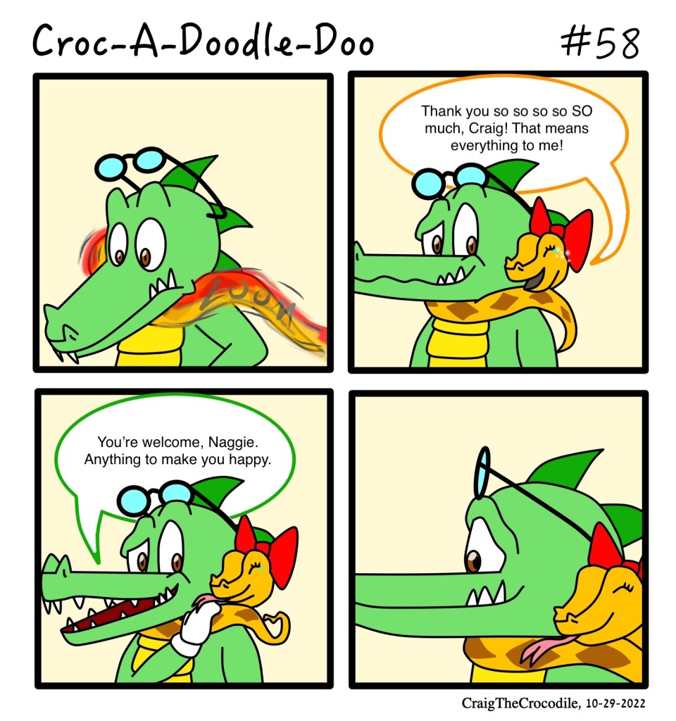 Croc-A-Doodle-Doo #58 Posted bycraigthecrocodileOctober 29, 2022October 28, 2022Posted inUncategorizedTags:Craig the Crocodile, Croc-A-Doodle-Doo, Naggie the Python “His True Feelings, Part Final” Share this: Share on X (Opens in new window) X Share on Facebook (Opens in new window) Facebook Like Loading... Related