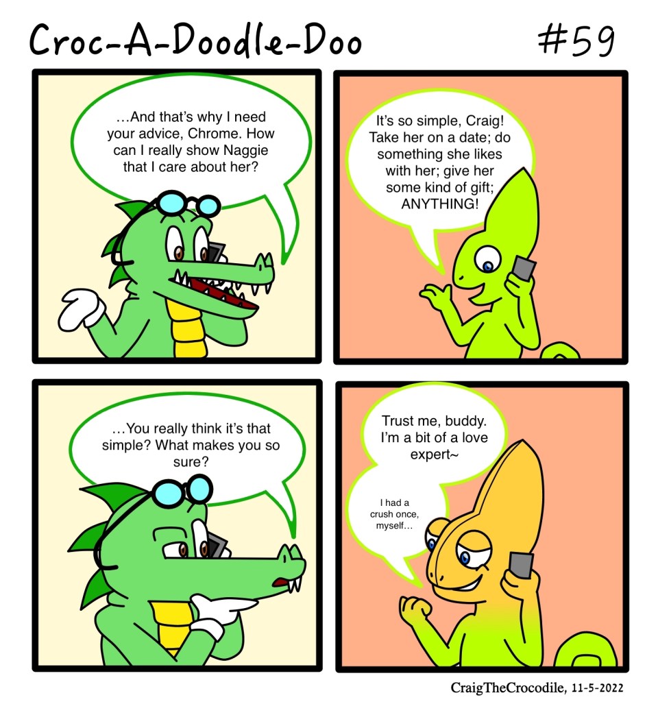 Croc-A-Doodle-Doo #59 Posted bycraigthecrocodileNovember 5, 2022November 4, 2022Posted inCroc-A-Doodle-DooTags:Chrome the Chameleon, Craig the Crocodile, Croc-A-Doodle-Doo “Asking For Advice” Share this: Share on X (Opens in new window) X Share on Facebook (Opens in new window) Facebook Like Loading... Related