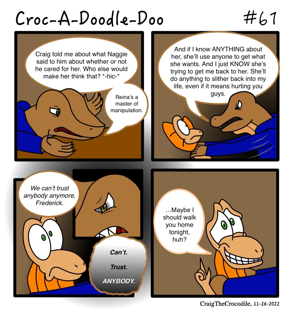 Croc-A-Doodle-Doo #61 Posted bycraigthecrocodileNovember 26, 2022November 25, 2022Posted inCroc-A-Doodle-DooTags:Croc-A-Doodle-Doo, Frederick the Frilled Lizard, Kodi the Komodo Dragon No One to Trust Share this: Share on X (Opens in new window) X Share on Facebook (Opens in new window) Facebook Like Loading... Related
