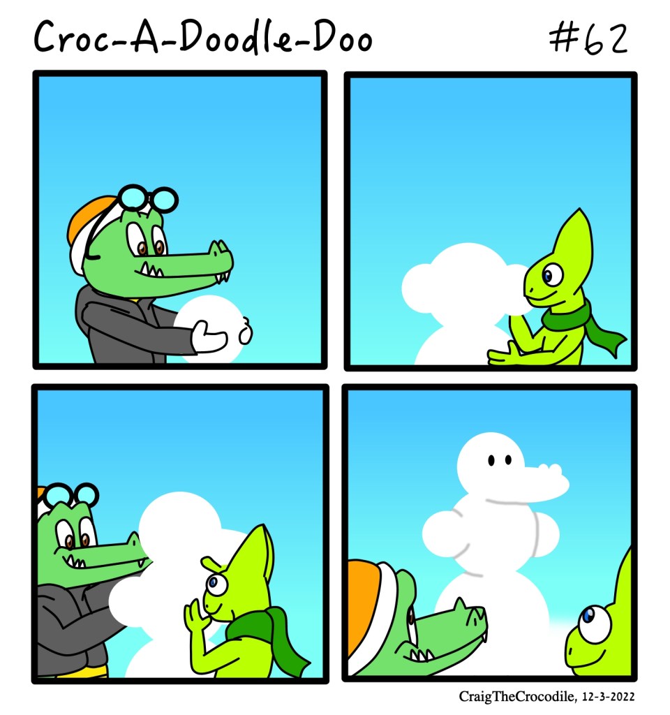 Croc-A-Doodle-Doo #62 Posted bycraigthecrocodileDecember 3, 2022December 2, 2022Posted inCroc-A-Doodle-DooTags:Chrome the Chameleon, Craig the Crocodile, Croc-A-Doodle-Doo Building a Snow-Croc Share this: Share on X (Opens in new window) X Share on Facebook (Opens in new window) Facebook Like Loading... Related