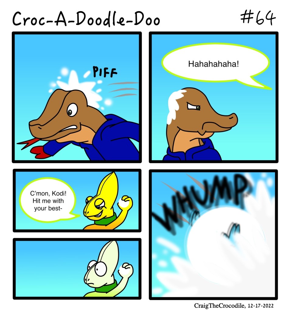 Croc-A-Doodle-Doo #64 Posted bycraigthecrocodileDecember 17, 2022December 16, 2022Posted inUncategorizedTags:Chrome the Chameleon, Croc-A-Doodle-Doo, Kodi the Komodo Dragon “Snowball Fight!” Share this: Share on X (Opens in new window) X Share on Facebook (Opens in new window) Facebook Like Loading... Related