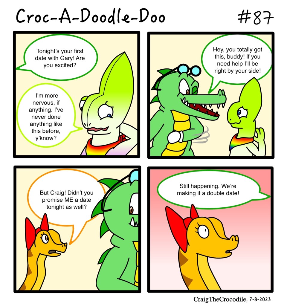 Croc-A-Doodle-Doo #87 Posted bycraigthecrocodileJuly 8, 2023July 8, 2023Posted inCroc-A-Doodle-DooTags:Chrome the Chameleon, Craig the Crocodile, Croc-A-Doodle-Doo, Naggie the Python Make It a Double Date Share this: Share on X (Opens in new window) X Share on Facebook (Opens in new window) Facebook Like Loading... Related
