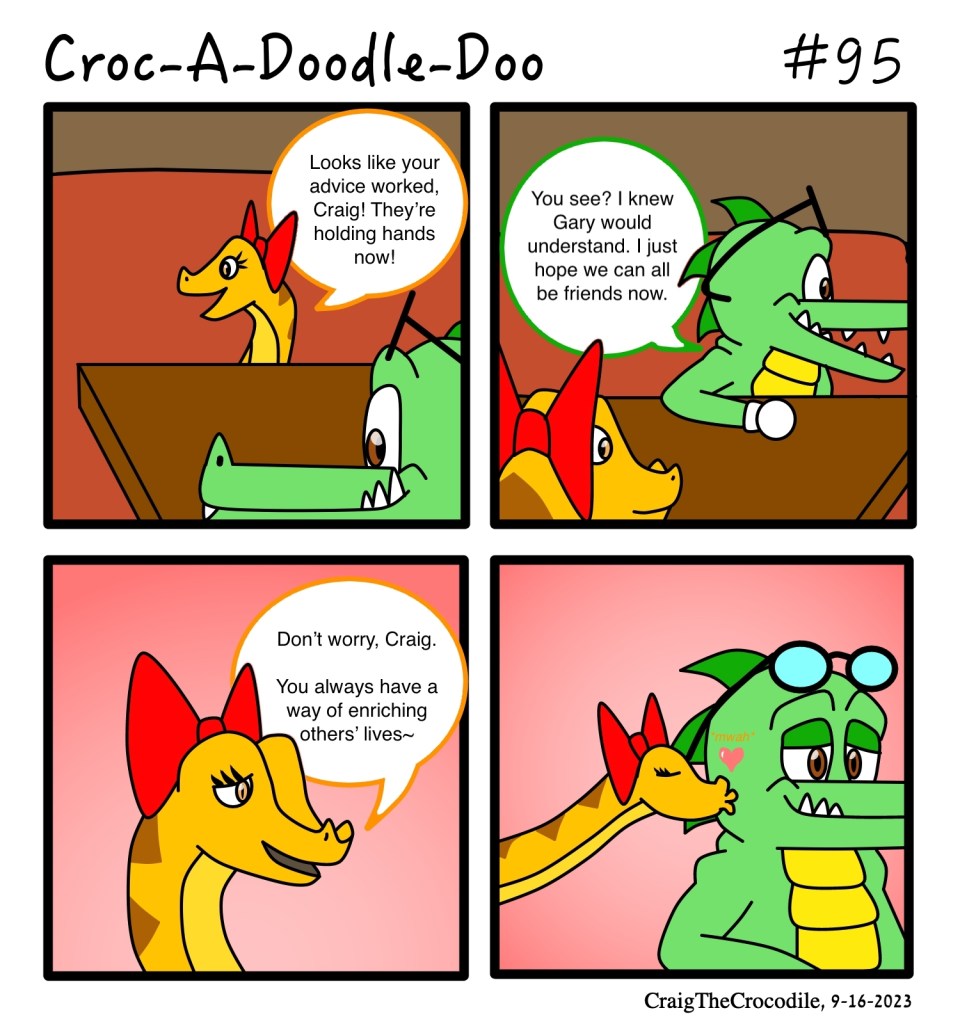 Croc-A-Doodle-Doo #95 Posted bycraigthecrocodileSeptember 16, 2023September 16, 2023Posted inCroc-A-Doodle-DooTags:Craig the Crocodile, Croc-A-Doodle-Doo, Naggie the Python The Double Date, Part Final Share this: Share on X (Opens in new window) X Share on Facebook (Opens in new window) Facebook Like Loading... Related