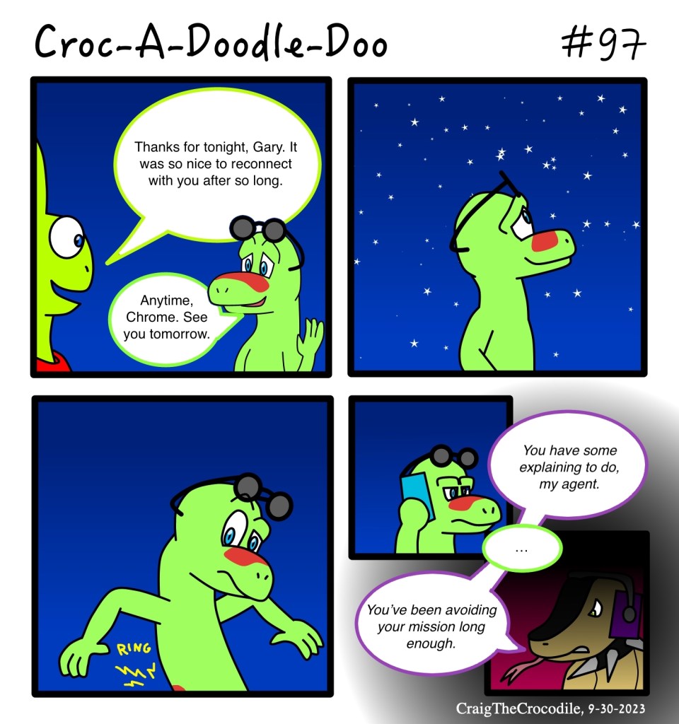 Croc-A-Doodle-Doo #97 Posted bycraigthecrocodileSeptember 30, 2023September 30, 2023Posted inCroc-A-Doodle-DooTags:Chrome the Chameleon, Croc-A-Doodle-Doo, Gary the Gecko, Reina the Cobra “The Call” Share this: Share on X (Opens in new window) X Share on Facebook (Opens in new window) Facebook Like Loading... Related