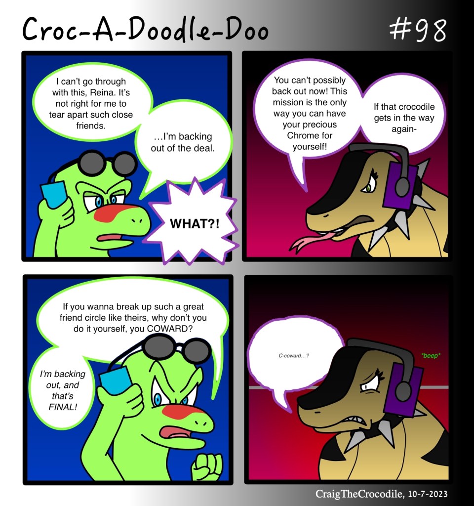 Croc-A-Doodle-Doo #98 Posted bycraigthecrocodileOctober 7, 2023October 7, 2023Posted inCroc-A-Doodle-DooTags:Croc-A-Doodle-Doo, Gary the Gecko, Reina the Cobra “Backing Out” Share this: Share on X (Opens in new window) X Share on Facebook (Opens in new window) Facebook Like Loading... Related