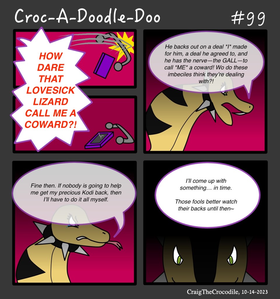 Croc-A-Doodle-Doo #99 Posted bycraigthecrocodileOctober 14, 2023October 14, 2023Posted inCroc-A-Doodle-DooTags:Croc-A-Doodle-Doo, Reina the Cobra “I’ll Do It Myself” Share this: Share on X (Opens in new window) X Share on Facebook (Opens in new window) Facebook Like Loading... Related