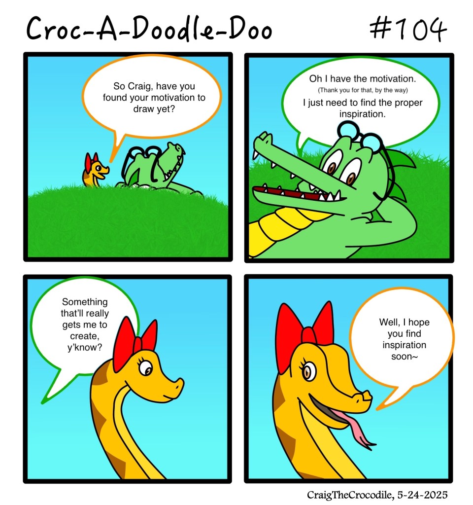 Croc-A-Doodle-Doo #104 Posted bycraigthecrocodileMay 24, 2025May 23, 2025Posted inCroc-A-Doodle-DooTags:Craig the Crocodile, Croc-A-Doodle-Doo, Naggie the Python “Needing Inspiration” Share this: Share on X (Opens in new window) X Share on Facebook (Opens in new window) Facebook Like Loading... Related