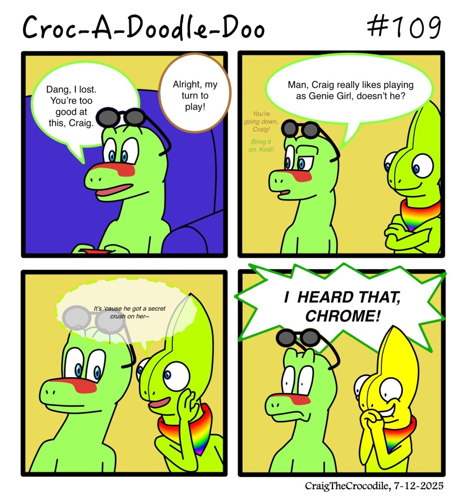 Croc-A-Doodle-Doo #109 Posted bycraigthecrocodileJuly 12, 2025July 11, 2025Posted inCroc-A-Doodle-DooTags:Chrome the Chameleon, Craig the Crocodile, Croc-A-Doodle-Doo, Gary the Gecko, Kodi the Komodo Dragon “A Fictional Crush” Share this: Share on X (Opens in new window) X Share on Facebook (Opens in new window) Facebook Like Loading... Related
