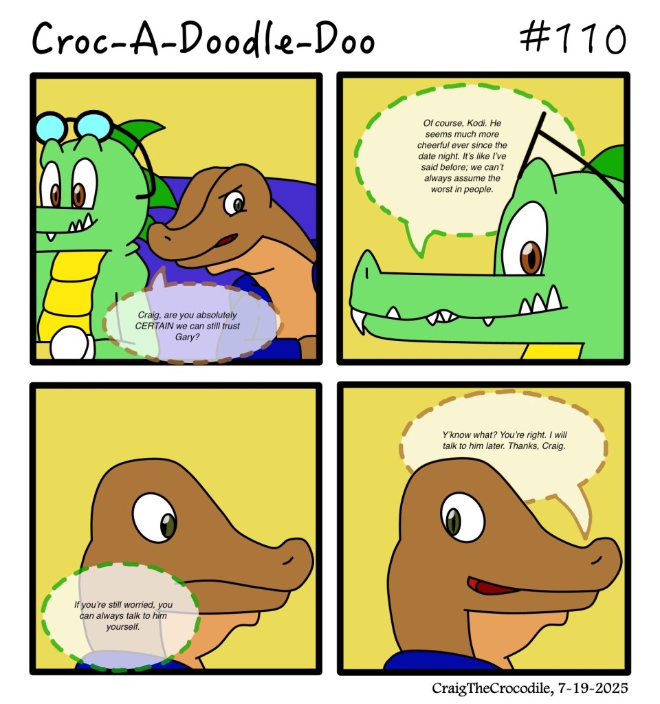Croc-A-Doodle-Doo #110 Posted bycraigthecrocodileJuly 19, 2025July 18, 2025Posted inCroc-A-Doodle-DooTags:Craig the Crocodile, Croc-A-Doodle-Doo, Kodi the Komodo Dragon “Can We Still Trust Him?” Share this: Share on X (Opens in new window) X Share on Facebook (Opens in new window) Facebook Like Loading... Related