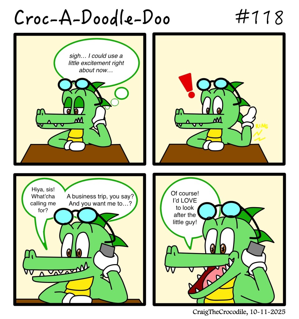 Croc-A-Doodle-Doo #118 Posted bycraigthecrocodileOctober 11, 2025October 11, 2025Posted inCroc-A-Doodle-DooTags:Craig the Crocodile, Croc-A-Doodle-Doo “A Surprise Favor” Share this: Share on X (Opens in new window) X Share on Facebook (Opens in new window) Facebook Like Loading... Related