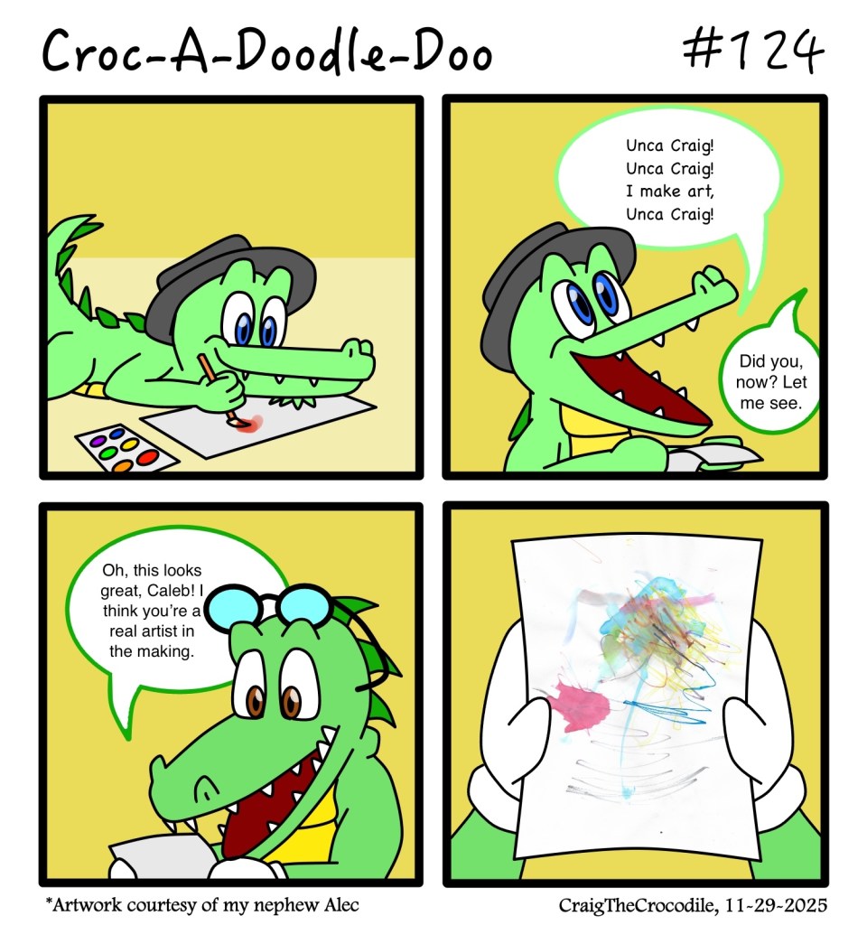 Croc-A-Doodle-Doo #124 Posted bycraigthecrocodileNovember 29, 2025November 29, 2025Posted inCroc-A-Doodle-DooTags:Caleb the Crocodile, Craig the Crocodile, Croc-A-Doodle-Doo “An Artist in the Making” Share this: Share on X (Opens in new window) X Share on Facebook (Opens in new window) Facebook Like Loading... Related