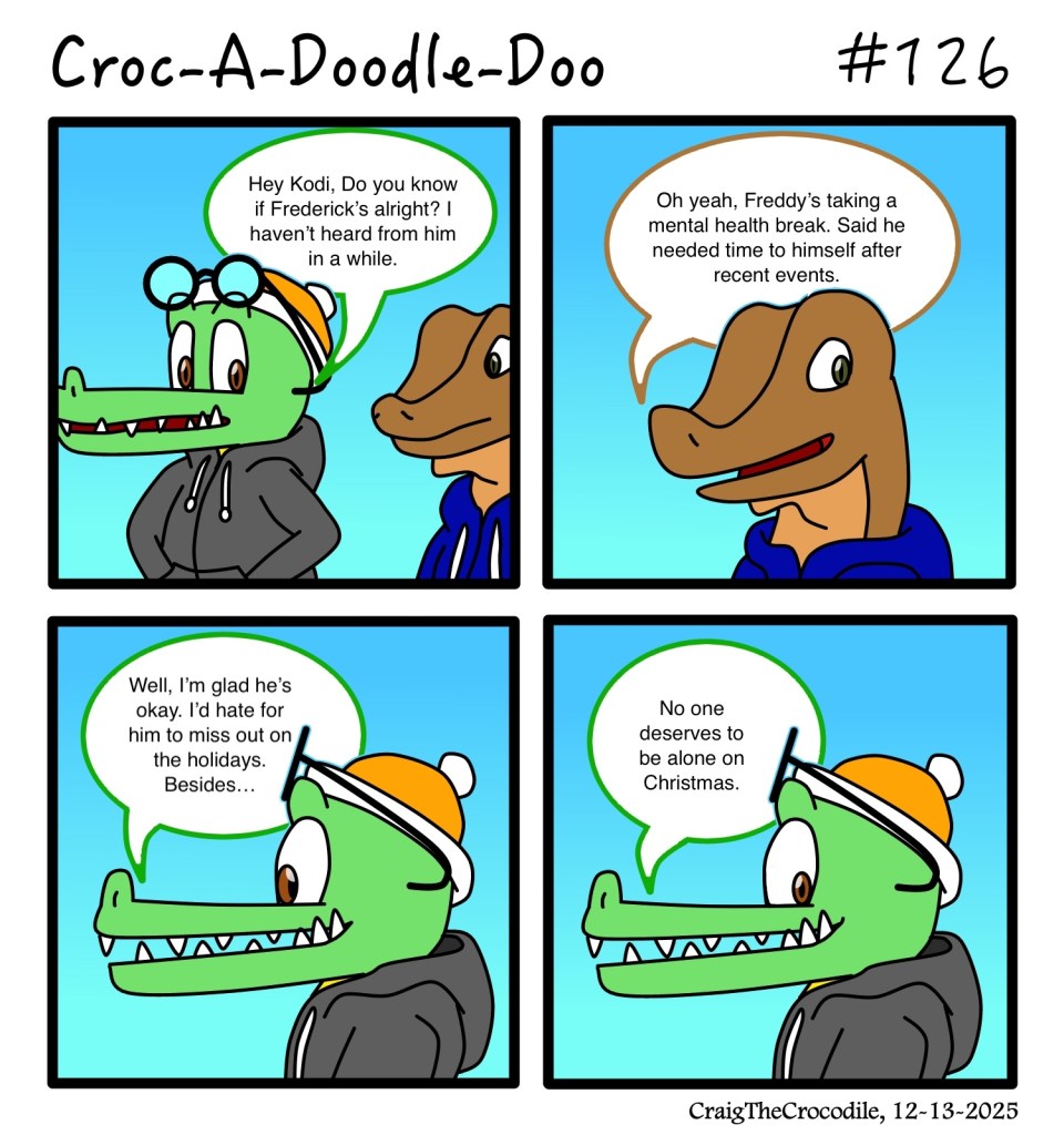 Croc-A-Doodle-Doo #126 Posted bycraigthecrocodileDecember 13, 2025December 13, 2025Posted inCroc-A-Doodle-DooTags:Craig the Crocodile, Croc-A-Doodle-Doo, Kodi the Komodo Dragon “Where’s Frederick?” Share this: Share on X (Opens in new window) X Share on Facebook (Opens in new window) Facebook Like Loading... Related