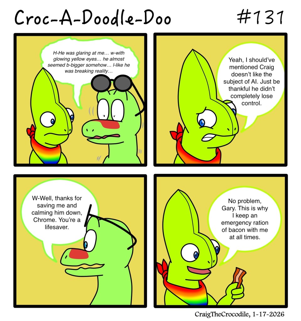 Croc-A-Doodle-Doo #131 Posted bycraigthecrocodileJanuary 17, 2026January 17, 2026Posted inCroc-A-Doodle-DooTags:Chrome the Chameleon, Croc-A-Doodle-Doo, Gary the Gecko “Emergency Bacon” Share this: Share on X (Opens in new window) X Share on Facebook (Opens in new window) Facebook Like Loading... Related