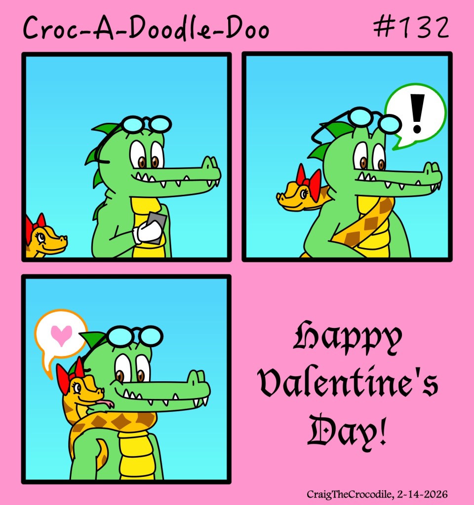 Croc-A-Doodle-Doo #132 Posted bycraigthecrocodileFebruary 14, 2026February 14, 2026Posted inCroc-A-Doodle-DooTags:Craig the Crocodile, Croc-A-Doodle-Doo, Naggie the Python Happy Valentine’s Day! Share this: Share on X (Opens in new window) X Share on Facebook (Opens in new window) Facebook Like Loading... Related