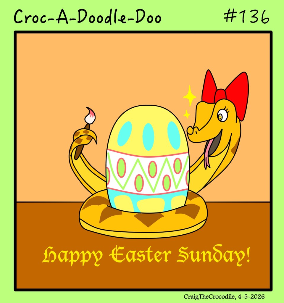Croc-A-Doodle-Doo #136 Posted bycraigthecrocodileApril 5, 2026April 5, 2026Posted inCroc-A-Doodle-DooTags:Croc-A-Doodle-Doo, Naggie the Python Happy Easter! Share this: Share on X (Opens in new window) X Share on Facebook (Opens in new window) Facebook Like Loading... Related