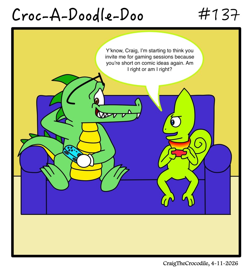 Croc-A-Doodle-Doo #137 Posted bycraigthecrocodileApril 11, 2026April 11, 2026Posted inCroc-A-Doodle-DooTags:Chrome the Chameleon, Craig the Crocodile, Croc-A-Doodle-Doo “An Excuse To Game” Share this: Share on X (Opens in new window) X Share on Facebook (Opens in new window) Facebook Like Loading... Related