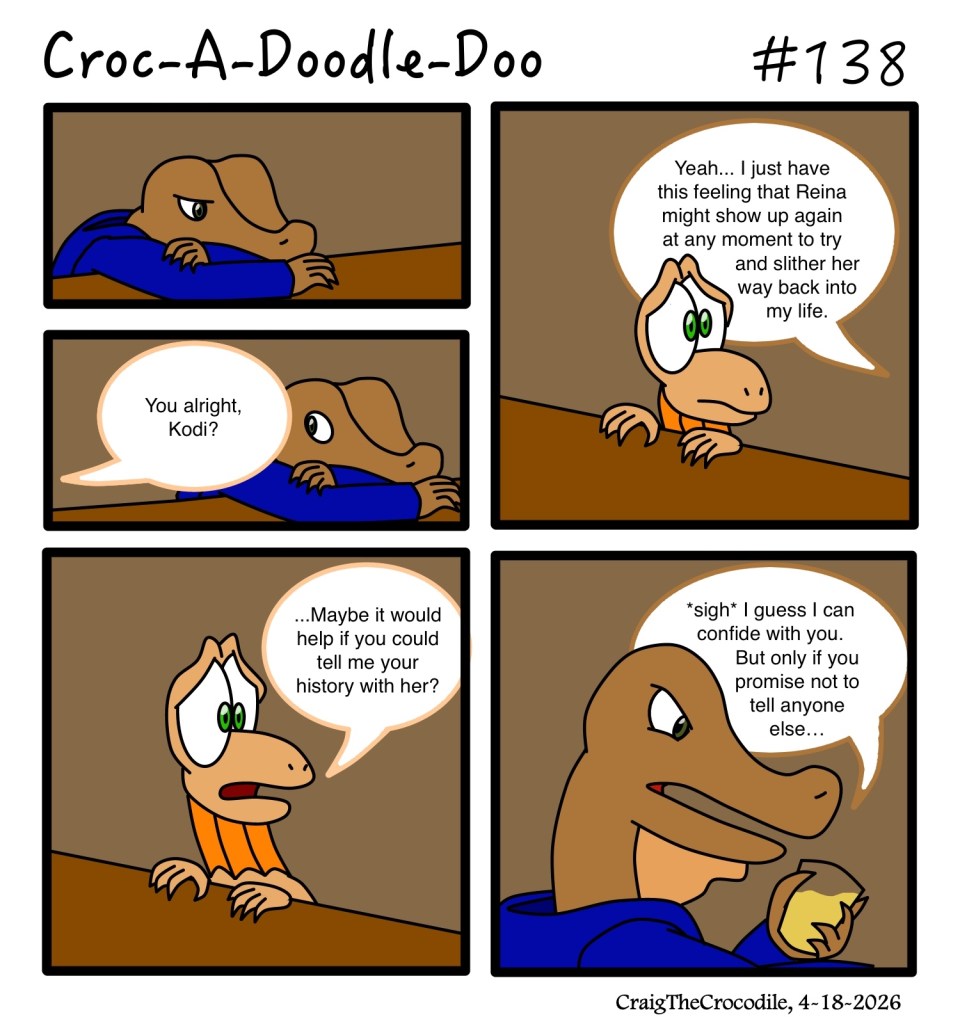 Croc-A-Doodle-Doo #138 Posted bycraigthecrocodileApril 18, 2026April 18, 2026Posted inCroc-A-Doodle-DooTags:Croc-A-Doodle-Doo, Frederick the Frilled Lizard, Kodi the Komodo Dragon Confiding Share this: Share on X (Opens in new window) X Share on Facebook (Opens in new window) Facebook Like Loading... Related